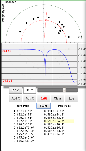 - The coordinates of the selected mark are also updated in the Zero/Pole pairs list at the bottom of the display. The selected mark is indicated in the Zero/Pole pairs list with yellow background color.